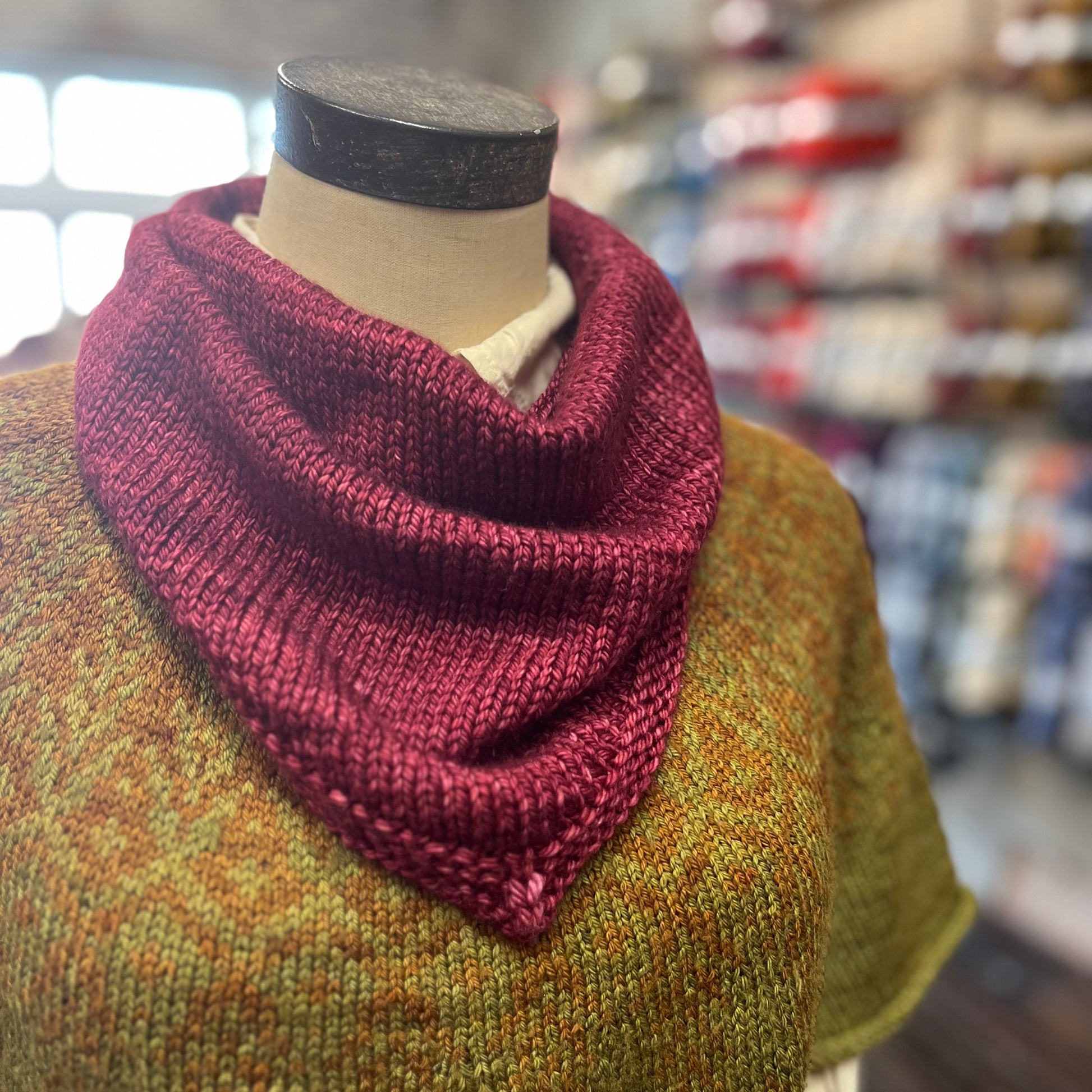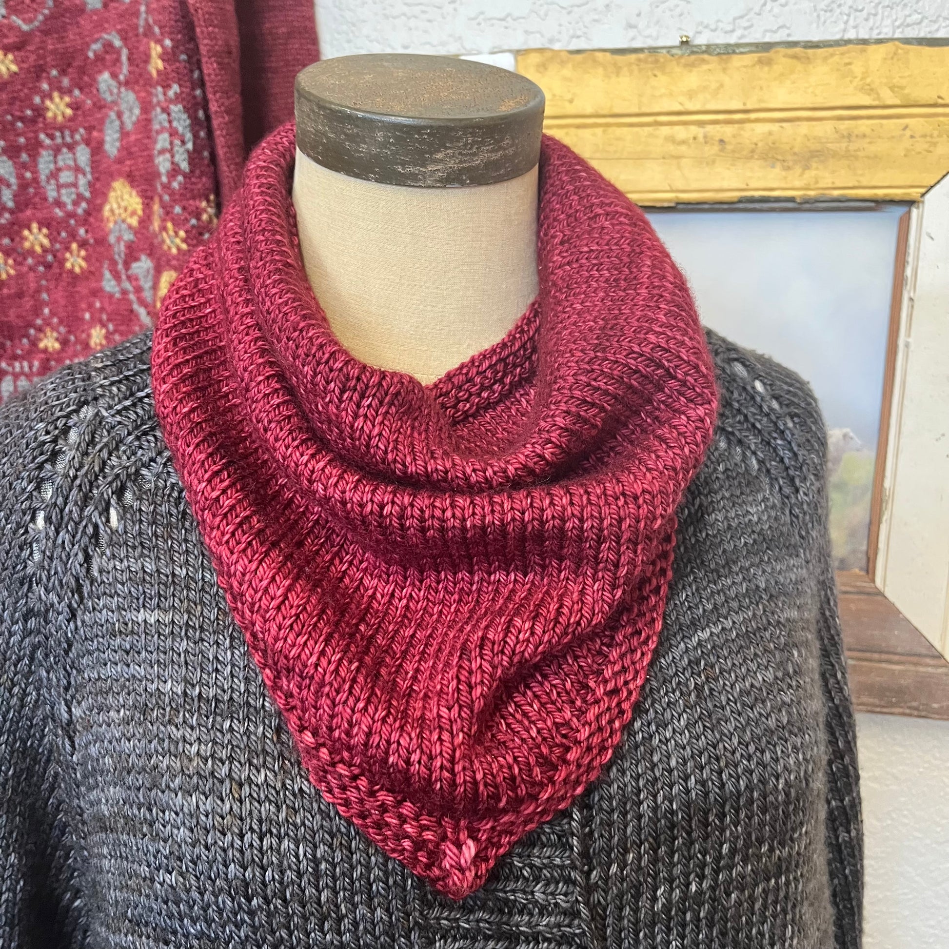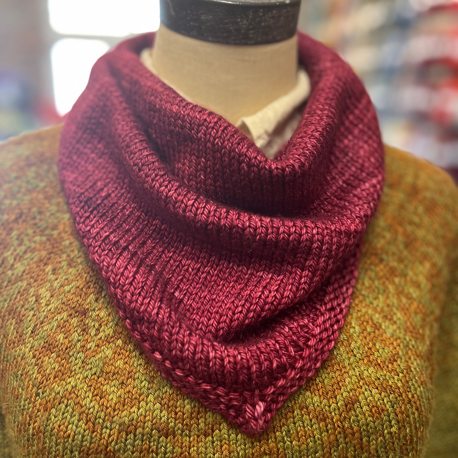 We will be making the bandana shown in pictures. This is a free pattern from Purl Soho called "Bandana Cowl". I made some slight revisions to the pattern. We will be using Aran weight and US 8 needles. I will be sending out the pattern and homework prior to class..